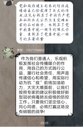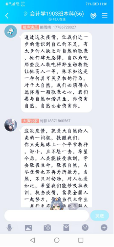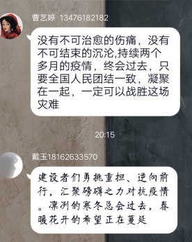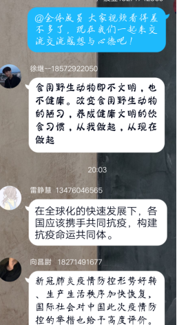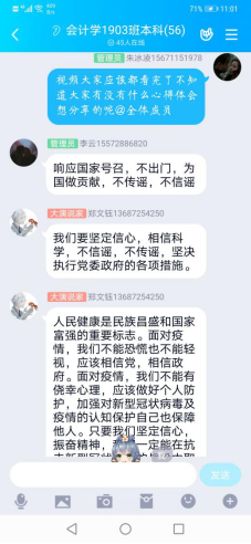 此次的“疫情防控思政大课”中,艾四林教授讲授的《在抗击疫情斗争中 深入理论学习》、秦宣教授讲授的《疫情大考告诉我们什么》、王炳林教授讲授的《总结历史经验 增强必胜信心》、冯秀军教授讲授的《战役里的最美青春——谈中国青年的责任与担当》直击大学生现阶段关心、关注的问题,有力指导了大学生在这个特殊时期应该做什么、怎么做。为了保证观看效果,各辅导员在班级群里发起讨论,鼓励学生把自己对祖国的热爱、对一线防疫英雄的赞美、对青年学生应有的责任和担当大胆表达出来,激起学生的爱国意识、感恩意识和担当意识。