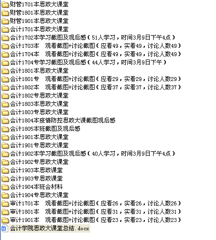 为深入贯彻落实学校《关于组织收看“教育部疫情防控思政大课”的通知》文件精神,会计学院辅导员充分发挥思政教育工作优势,于3月9日下午2:30到晚间9:30以线上班会的形式,组织各班级学生观看了“全国大学生同上一堂疫情防控思政大课”。此次观看活动实现了全覆盖,学生参与率达到95%以上。