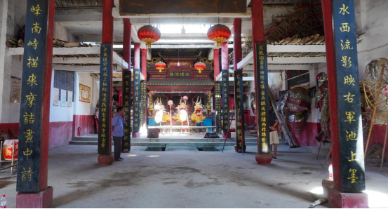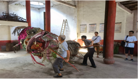 在王贤军书记的带领下,调研团队师生来到王贵湾祠堂,近距离感受王贵武龙灯的震撼。他介绍,过去在每次武龙灯之前,龙灯成员都会在祠堂进行“请龙神”仪式,结束后便将那纸质的龙灯烧毁,意在把龙神送回去。现在因为环保及用火安全等原因,王贵武龙灯制作了布艺的龙头龙尾,摆置在祠堂中便于多次使用。