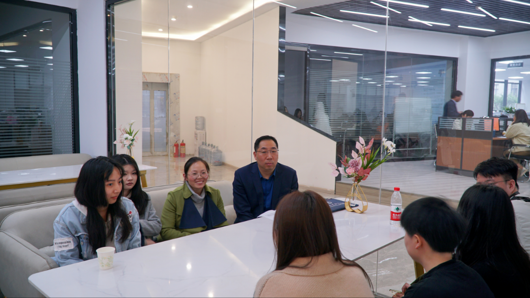 会谈后在刘经理的陪同下,易有明一行参观了企业的整个工作环境并看望慰问我院在企业实习工作的五名学生。他关切地询问学生入职时间,工作内容,负责过的项目等,反复核实大家是否适应工作节奏,衣食住行如何解决,是否有实际困难需要解决等。同学们感谢了院长的关心并表示公司都是年轻人,工作氛围很轻松,没有什么困难。企业也对同学们的表现给予高度肯定,能遵守企业的规章制度,组织纪律性较强,综合素质较高,希望与我校进行持续供需对接,不断拓展产教融合、校企合作,提高学生培养质量和就业质量。